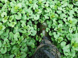 Garlic mustard (Alliaria petiolata) is a biennial, meaning each plant lives its life over two growing seasons. Seedlings emerge in early March, forming a rosette of leaves the first year. The leaves are alternate, triangular to heart shaped, have scalloped edges and give off an odor of garlic when crushed. The odor can be used to distinguish garlic mustard from native plants like evergreen violet (Viola sempervirens), piggy-back plant (Tolmiea menziesii), fringecup (Tellima grandiflora) and non-native plants such as silver dollar plant (Lunaria annua).