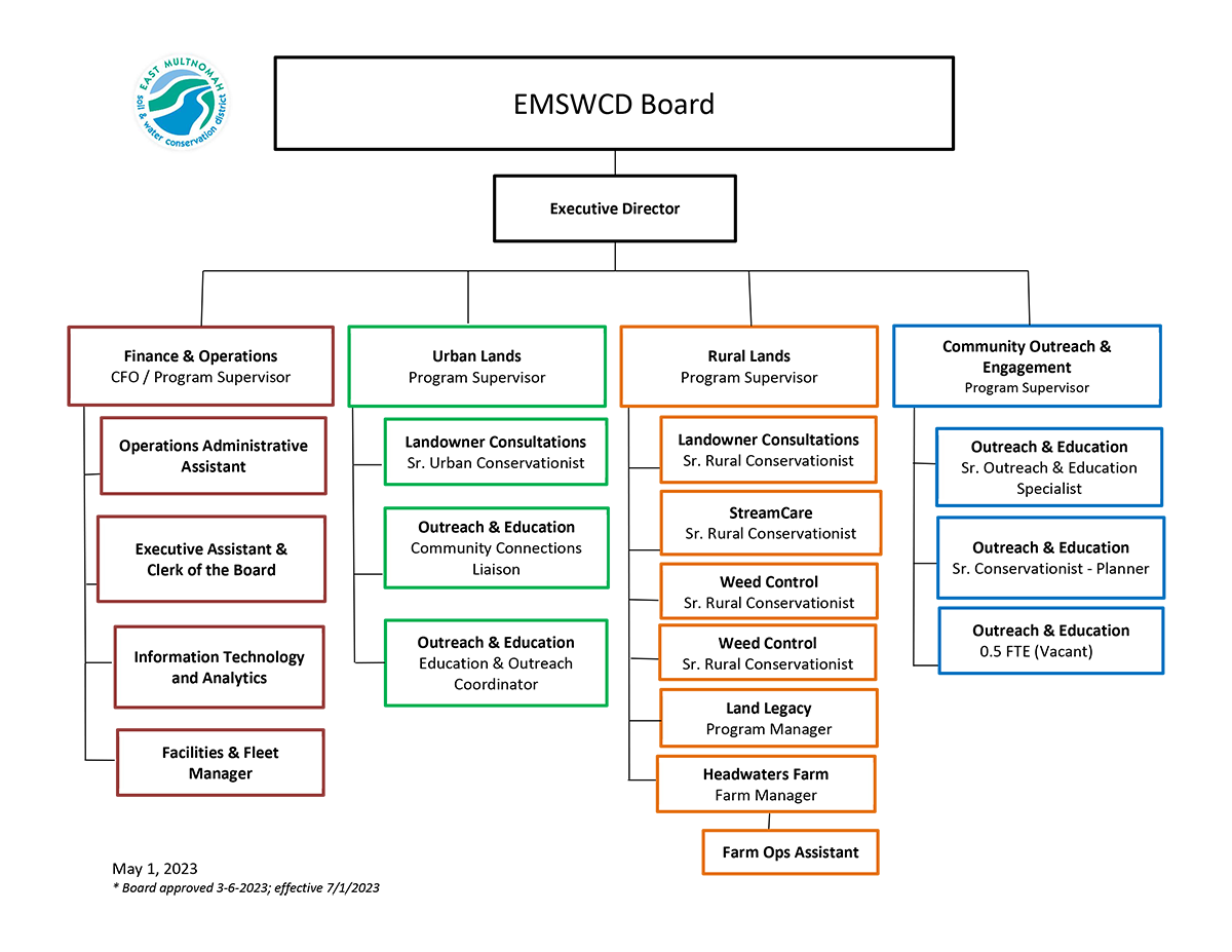 East Multnomah Soil and Water Conservation District is divided into four program areas: Finance & Operations, Rural Lands, Urban Lands and Community Outreach and Engagement. The organizational chart below lays out the structure of our staff organization.