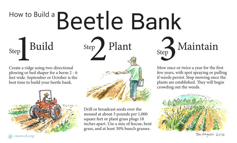 - Step 1 – Build it: Create a ridge using two-directional plowing or bed shaper for a berm 2-6 feet wide. The best time to build your beetle bank is in September or October.