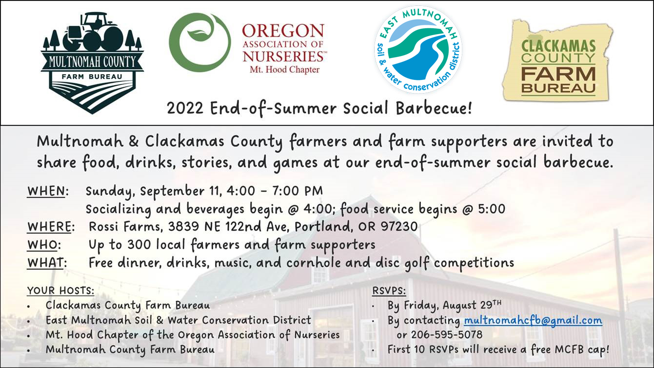 Flier: 2022 End of Summer Social Barbecue! / Multnomah and Clackamas County farmers and farm supporters are invited to share food, drinks, stories and games at our end-of-summer social barbecue. / When: Sunday, September 11th, 4-7 PM / Where: Rossi Farms, 3839 NE 122nd Ave, Portland, OR 97230 / Who: Up to 300 local farmers and farm supporters / What: Free dinner, drinks, music, and cornhole and disc golf competititions. Your hosts: Clackamas County Farm Bureau, East Multnomah Soil and Water Conservation District, Mt. Hood Chapter of the Oregon Association of Nurseries, Multnomah County Farm Bureau