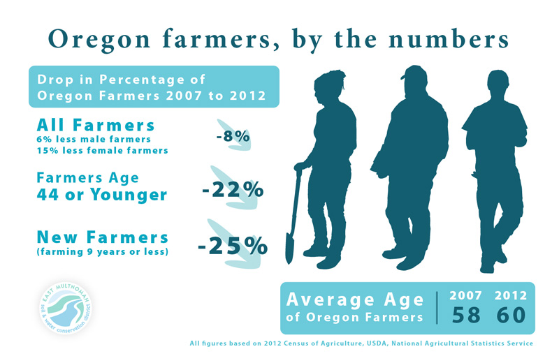 • There were eight percent fewer farmers in Oregon from 2007 to 2012, with six percent less males and 15% less female farmers.