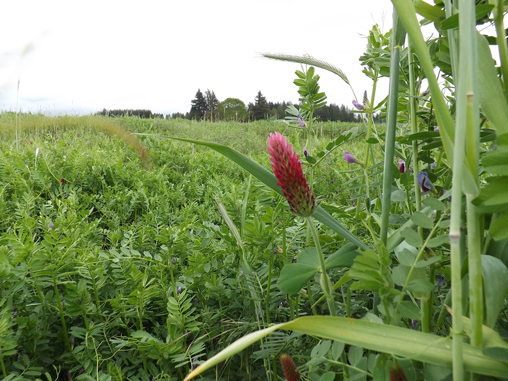 Cover crops at Headwaters Farm ← Previous Next → A lone crimson clover bloom in a sea of winter cover crop.