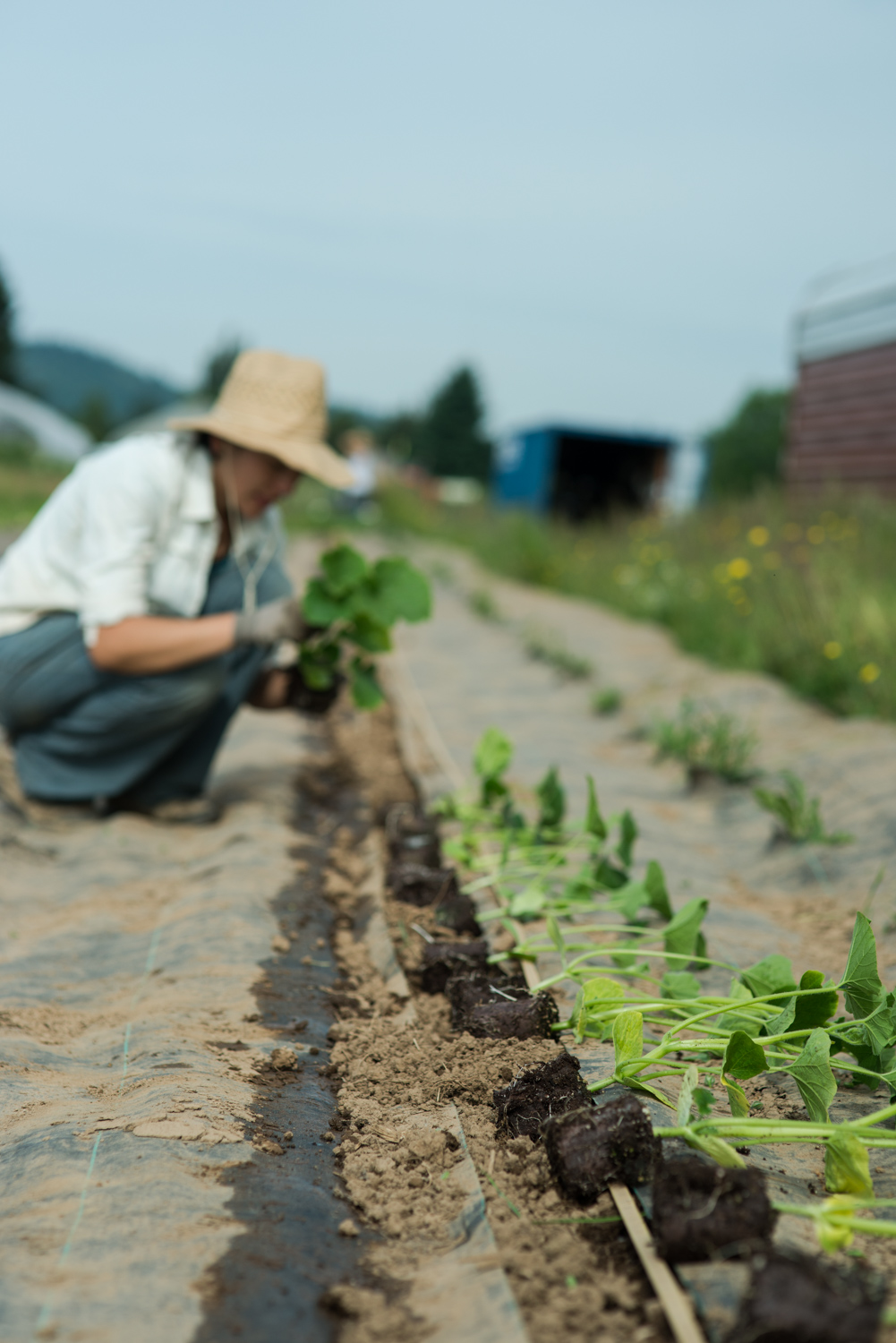 A farmer plants starts in landscape fabric, which helps protect against weeds and can be reused