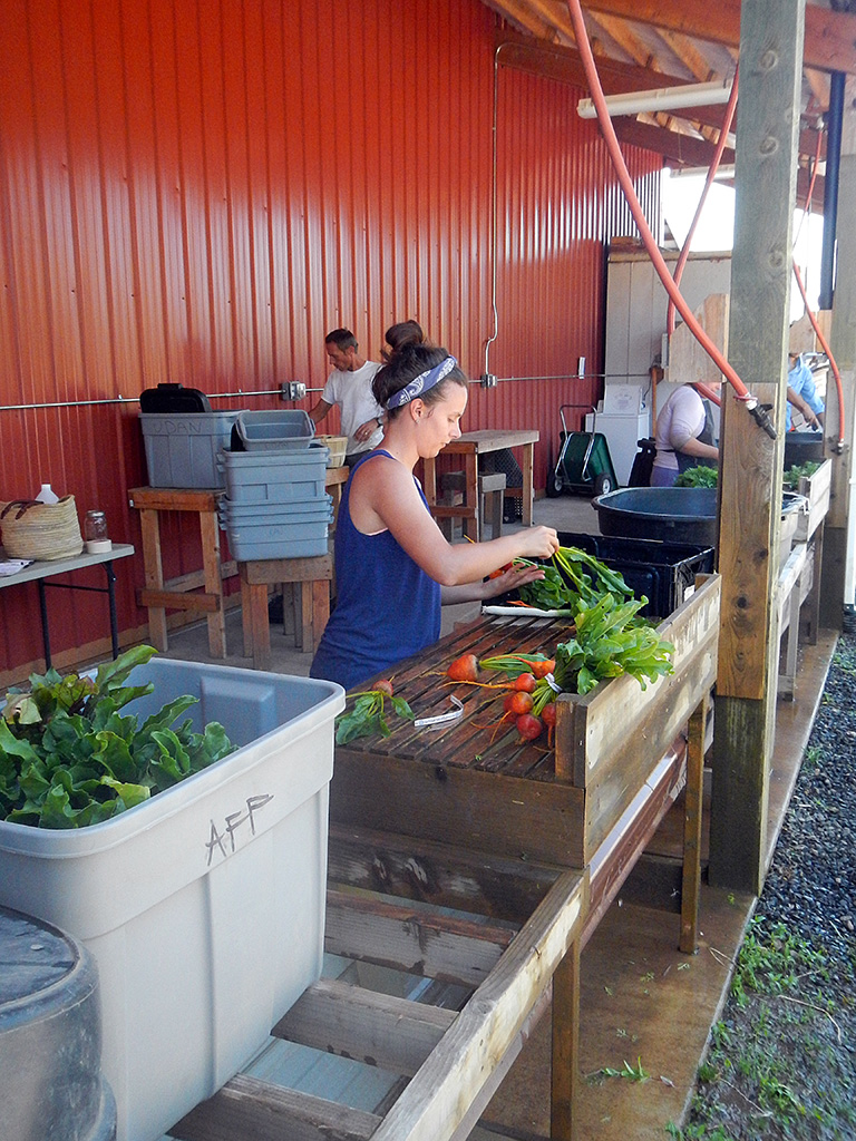 Farmers using the wash stations ← Previous Next → Farmers from Abundant Fields Farm sort, bunch, and wash produce for the Montavilla Farmers Market.