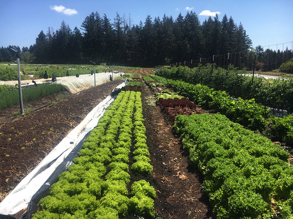 Rows of vegetables in the Farm Punk Salads plots at Headwaters Farm