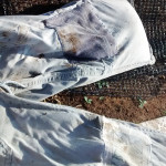 It is almost painful to throw away a pair of pants just because they have a hole in the knee. And considering that 10.5 million tons of clothing heads to the landfill every year – or about 5% of the landfill waste overall – it hurts more than just my own sensibilities. So I was delighted to find a blog post from Fiddlehead Farm (link) about using old pants to create sand or soil bags. The bags are used to hold down shadecloth , tarps, floating row covers (used for plant protection from bugs and cold temperatures), or a myriad of other uses on a farm in a land that is blessedly not abundant with large rocks.