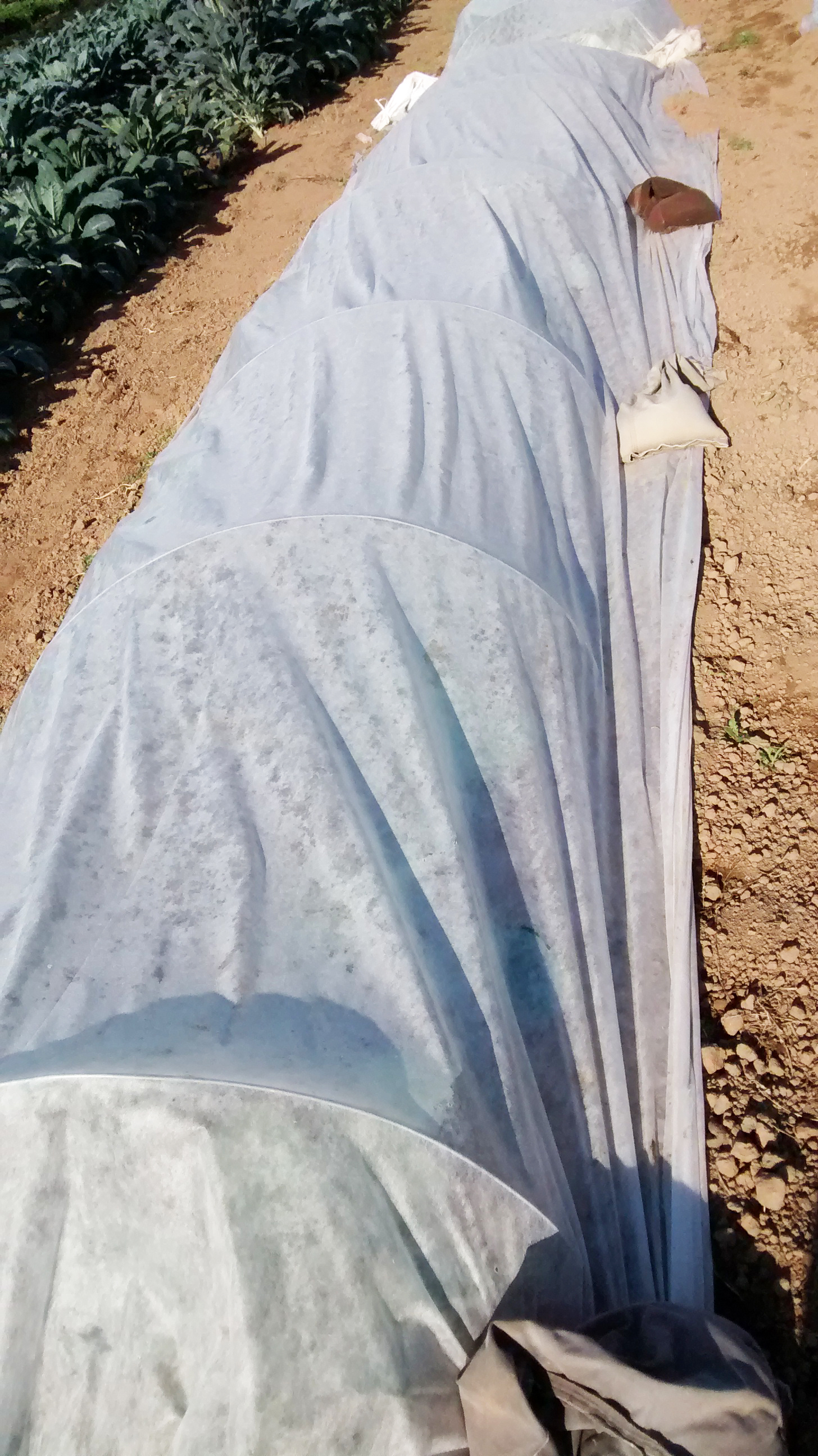 Sewn pants as soil bags 2 ← Previous Next → Used pant soil bags hold down floating row covers, which are used to protect plants from cold, wind and pests.