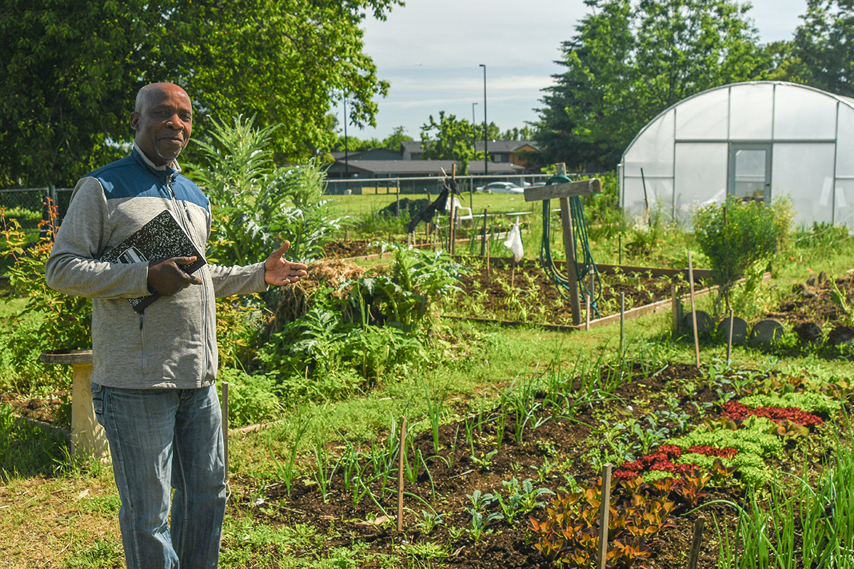 Our-Village-Garden ← Previous Next → Eca-Etabo Wasongolo, Community Organizer for Our Village Garden, shows off their growing garden in North Portland. Photo courtesy of Our Village Garden.
