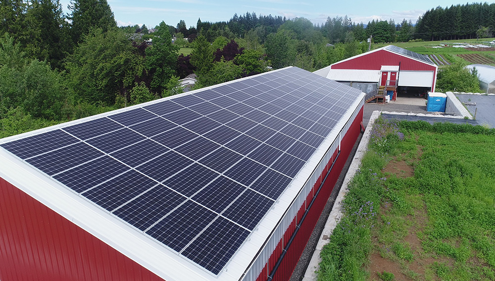 Headwaters Solar Panels Next → A view of both solar panel installations at Headwaters Farm: on the equipment shed in the foreground and on the barn in the background