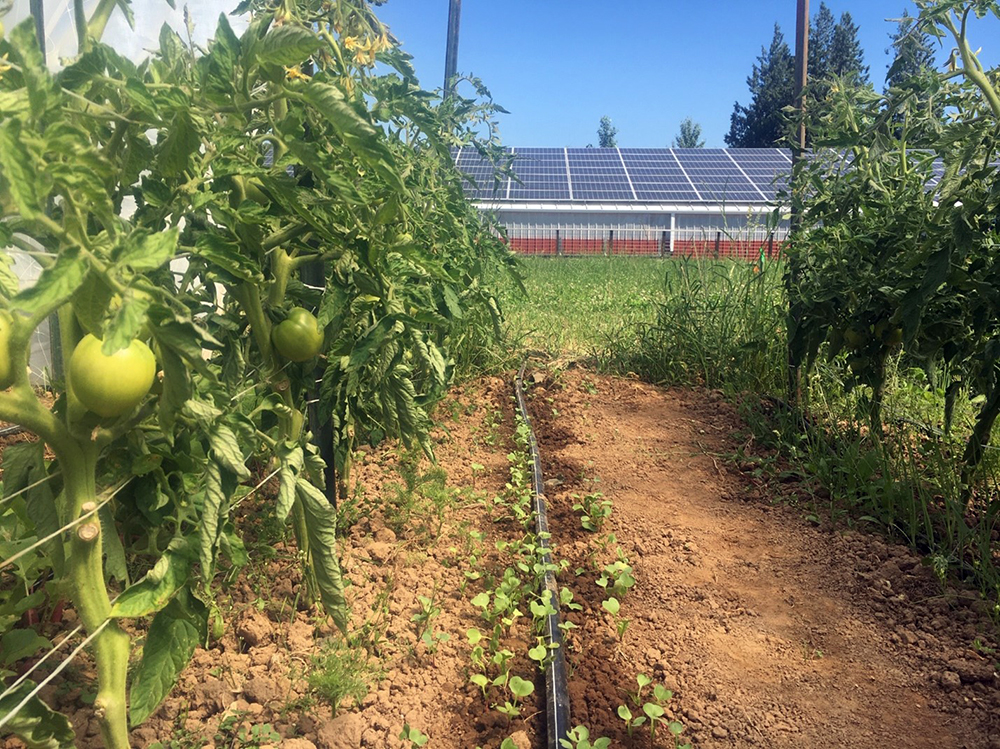 Tomato plants and solar panels ← Previous Next → The solar panels on the storage shed are visible over a retaining wall from this vantage on one of the farm plots at Headwaters