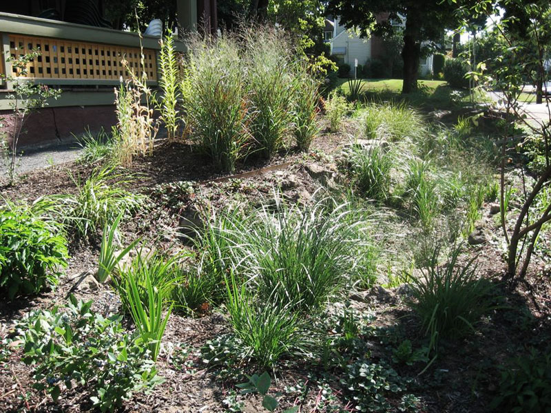 Rain Garden 3 ← Previous Next → Slough sedge, a sun loving native, make up the majority of the plants in this front yard rain garden.