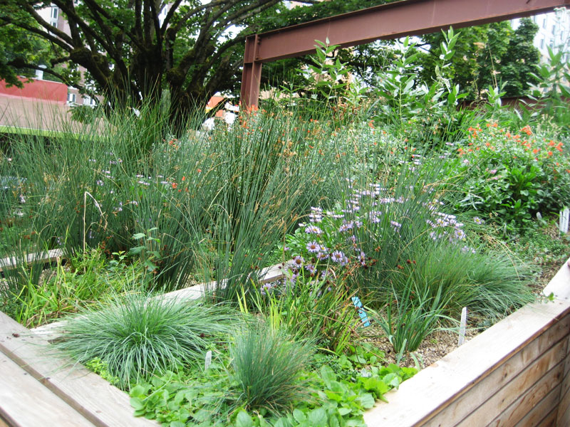 This “ecoroof” (actually at ground level!) is a demonstration of an “intense ecoroof.” Intense ecoroofs have much deeper planters than regular ones, and require more structural support.