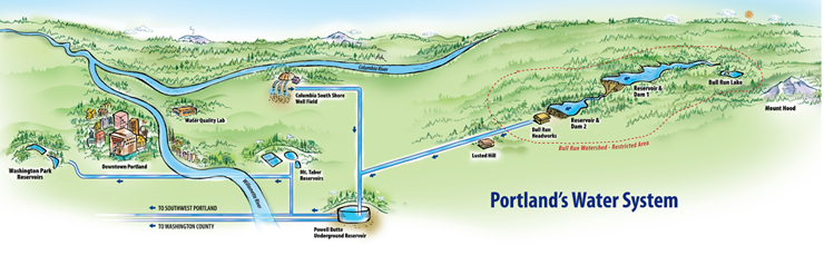 PWB-Portland-water-system-illustration ← Previous An illustration of our water system, courtesy of the Portland Water Bureau. On the far right is Bull Run Lake, and at the top middle is the Columbia South Shore Well Field.