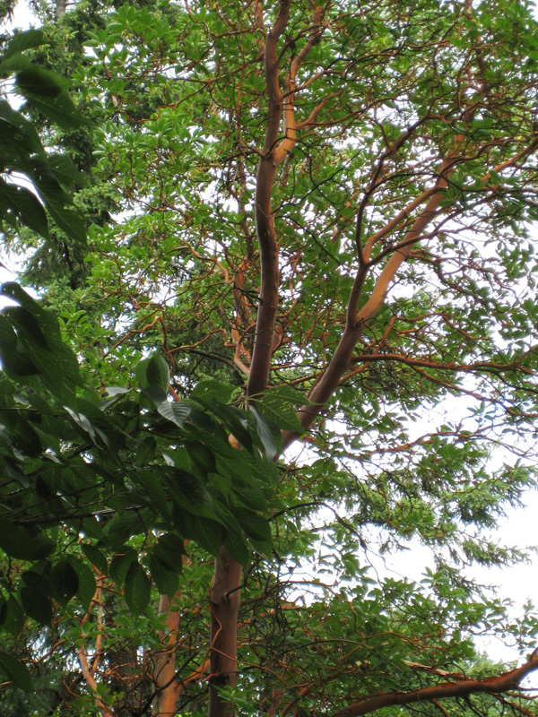 Madrone is an attractive, broad-leaved evergreen tree with a twisting trunk that develops beautiful reddish-brown exfoliating bark with age. Mature size ranges from 20 to 65 feet tall and wide. Madrone does best in full sun and grows well on hillsides with dry, well-drained or rocky soils. Leaves are dark, shiny green and shed irregularly throughout the year.