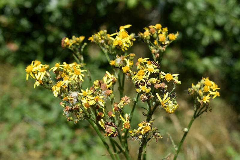 Tansy weed (Senecio jacobaea) in bloom with cinnabar moth caterpillars feeding on it