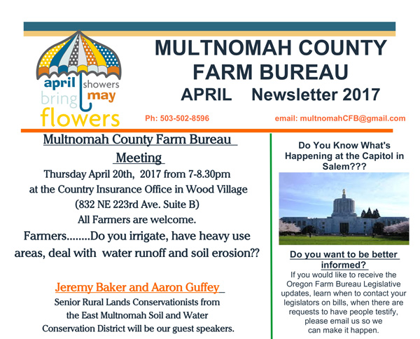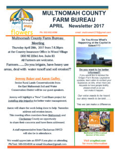 Join us on Thursday, April 20th at the next Multnomah County Farm Bureau meeting! Jeremy Baker and Aaron Guffey, two of our Senior Rural Conservationists, will both present at the meeting as guest speakers. Jeremy will speak about a new cost-share project for installing drip irrigation for better water management, and Aaron will share the work EMSWCD is doing with nurseries to help address erosion issues. Staff from Clackamas SWCD will also be in attendance.