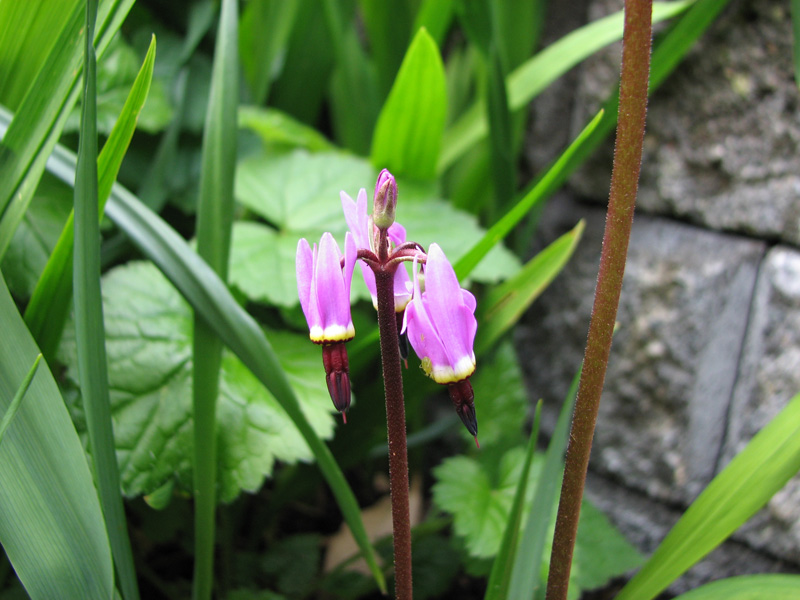 Broad-leaf shooting star (Dodecatheon hendersonii) has an interesting “inside-out” bloom and is summer deciduous, dying back to the ground after the rains cease.