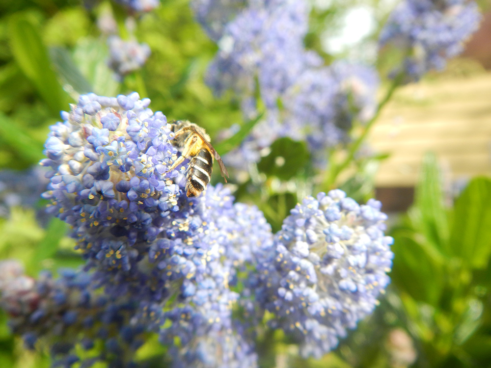 A bee visits the flowers on some blue blossom ceanothus. Whenever possible, buy organic or naturally-grown native plants to protect pollinators.